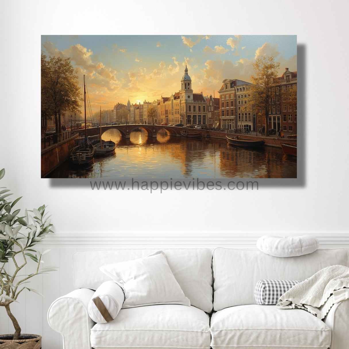 Step onto a historic bridge as the day ends, where the setting sun bathes the canal houses and ancient waterways in a luminous, golden glow. This “Golden Canal Glow” artwork is more than just a beautiful European cityscape wall decor—it’s a tranquil moment captured forever, a poetic invitation to peace, reflection, and the quiet beauty of travel. Our captivating Amsterdam Canal Art features charming boats and historic architecture reflected in the still water, inviting a deep sense of peace, thoughtful imagination, and nostalgic warmth into your environment. It’s a beautifully rendered piece, designed to inspire wanderlust, awaken your sense of history, and infuse your space with serene positivity.