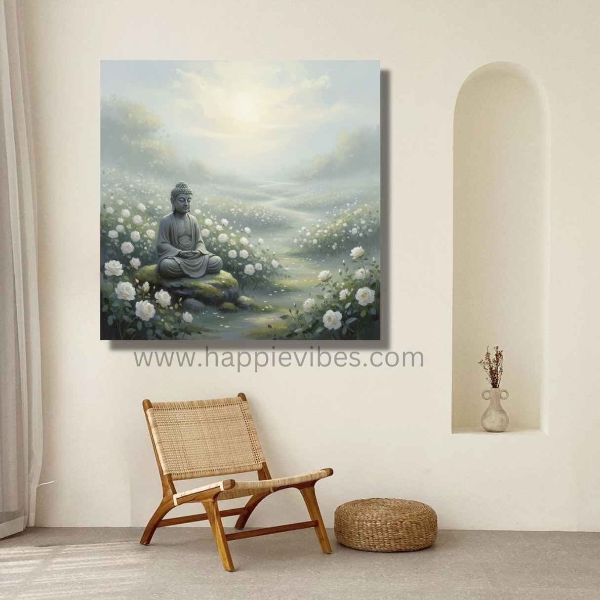 - Gaze upon the tranquil figure of the Buddha, seated upon a mossy stone amidst a sea of luminous white roses and soft mist, where a winding stream disappears into the glowing distance. This “White Rose Meditation” artwork is more than just a white flower zen garden decor print—it’s the artist’s imagination of a sacred, misty retreat, embodying purity, serenity, and quiet devotion. Our captivating Buddha Spiritual Art features the figure surrounded by symbolic white roses and gentle sunlight, inviting a deep sense of serenity, boundless imagination, and quiet, profound warmth into your environment. It’s a beautifully rendered piece, designed to inspire stillness, awaken your deepest desire for calm, and infuse your space with deep, tranquil positivity.