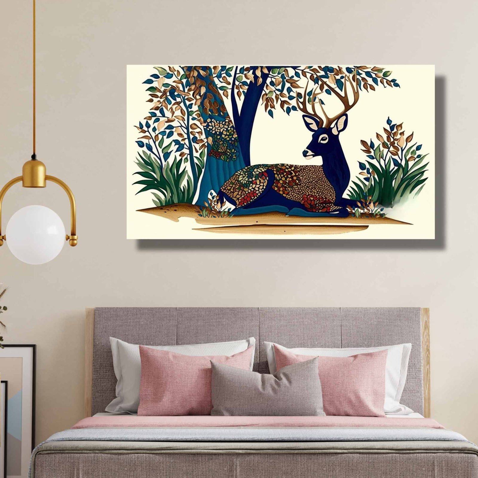 This elegant deer canvas painting portrays a beautifully patterned deer resting peacefully under the shade of a tree. The intricate detailing and earthy tones give the artwork a refined, cultural, and serene aesthetic, making it an ideal choice for homes that celebrate nature and grace.
