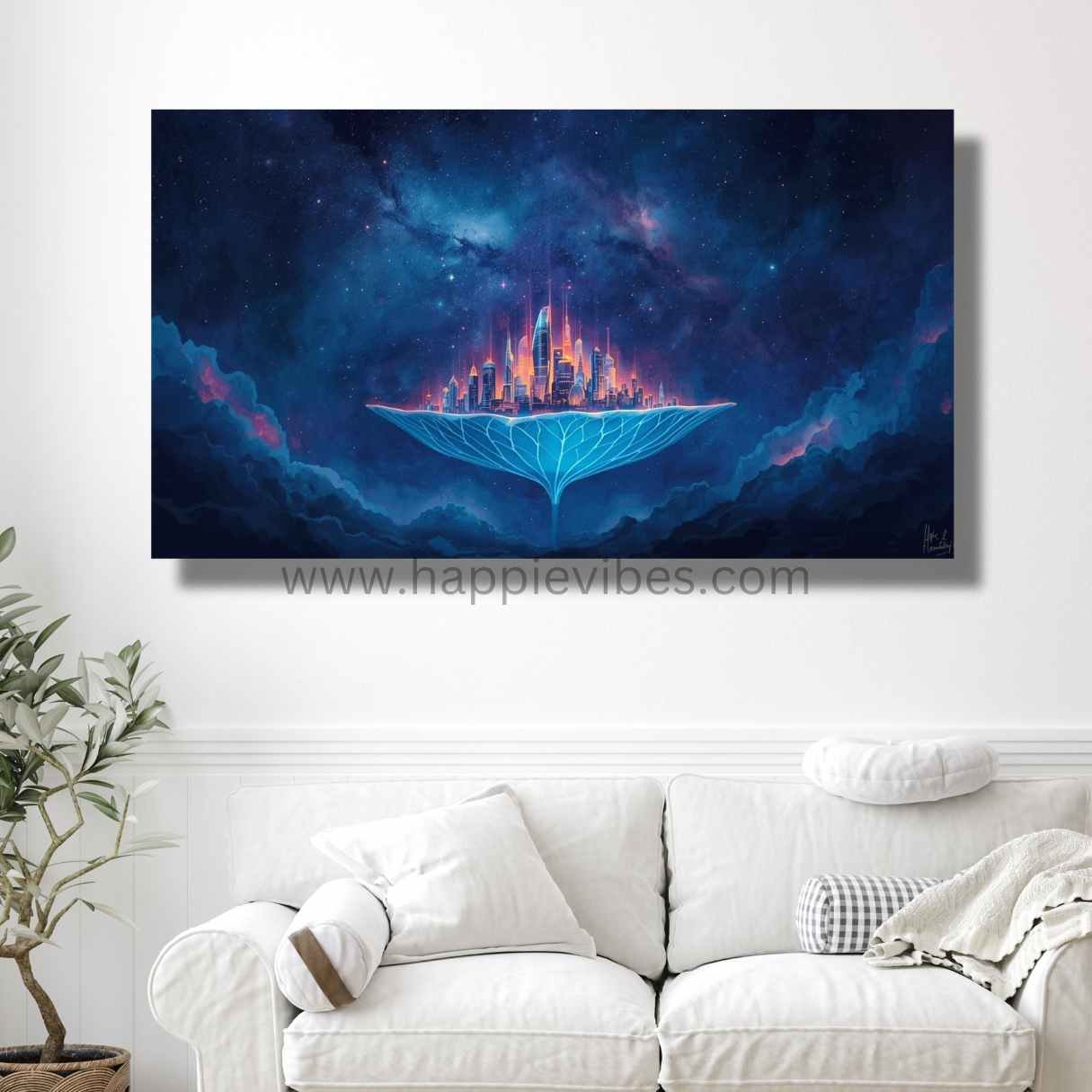 Allow this inspiring Floating City Wall Art to transform your modern home decor or mindful office decor into a statement of unparalleled vision and unique design. It elevates the aesthetic, sparks conversations about technology and dreams, and reinforces the belief that the sky is not the limit—it’s the view. Perfect for living areas, creative studios, or as an unforgettable gifting option. To find more unique and inspiring art for your home or office, explore our full collection of categories here: https://www.happievibes.com/shop/. This unique artwork is an original vision of Happie Vibes, created and curated by the artist. We guarantee the highest quality product, designed to infuse your space with positivity and lasting beauty.