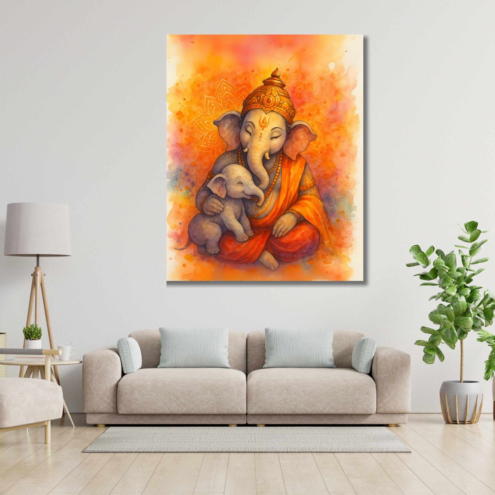 Ganesha abstract art meets heartfelt emotion in this captivating canvas painting of Lord Ganesha gently cradling a baby elephant. The soft watercolor hues, playful warmth, and modern artistic interpretation create a truly divine yet contemporary artwork. The flowing oranges and gentle textures echo love, protection, and the joyful bond of the divine.