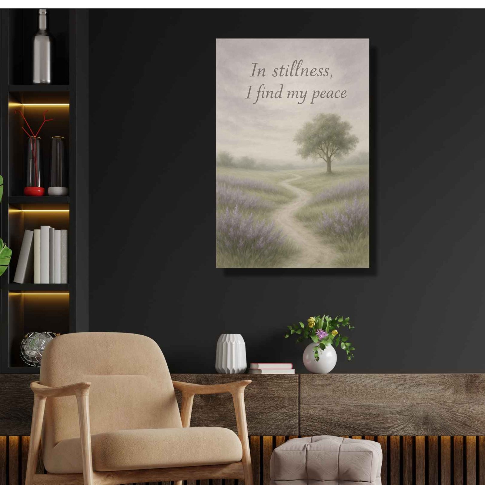 Step onto a gentle path winding through soft lavender fields, where every breath brings a sense of calm. This “Stillness & Peace” artwork is more than just wall decor—it’s an invitation to pause, reflect, and reconnect with your inner sanctuary. Our serene lavender field art captures the essence of quiet beauty and profound tranquility, reminding you that “In stillness, I find my peace.” It’s a beautifully rendered affirmation print, designed to infuse your space with a sense of calm and gentle mindfulness.