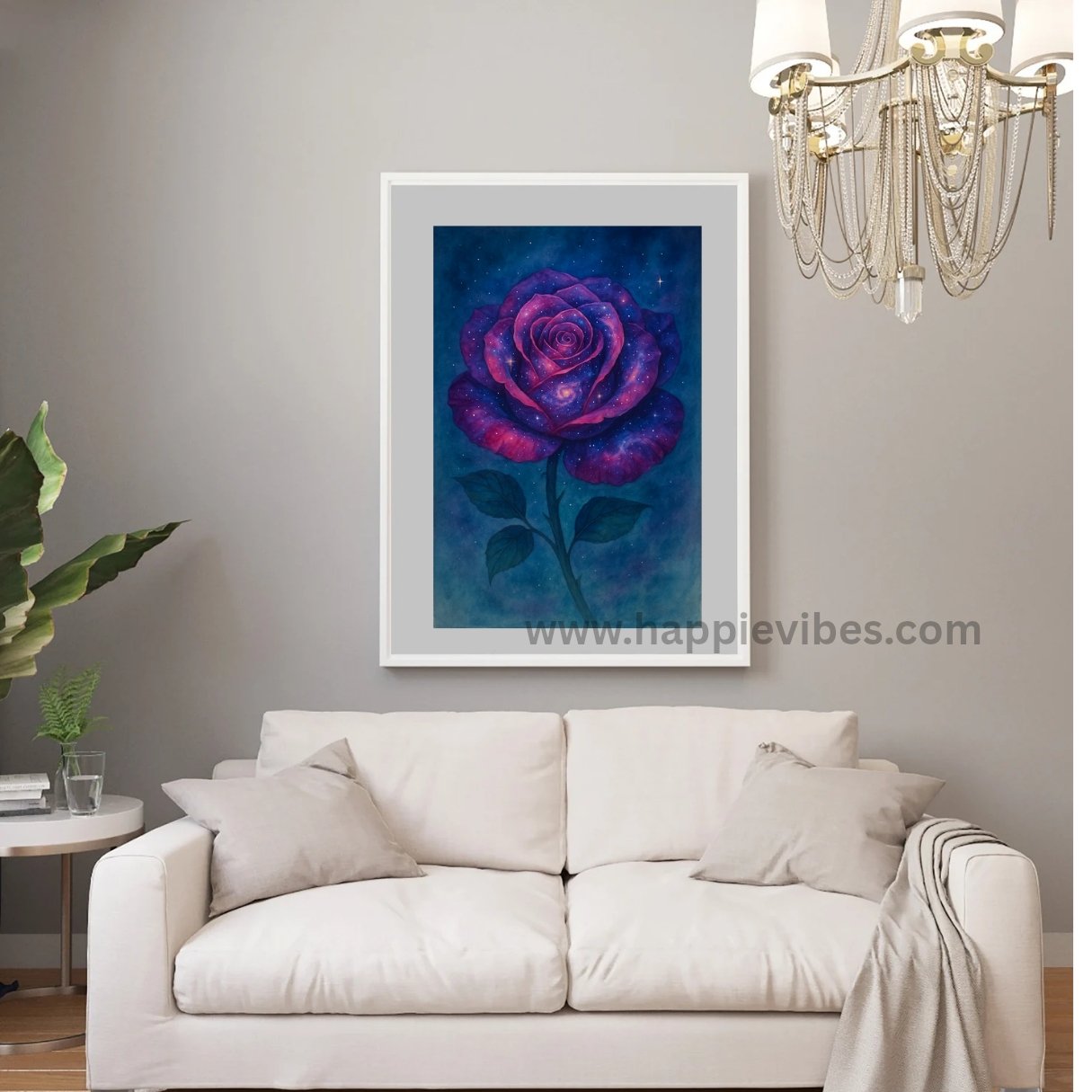 As a cosmic floral wall art, it infuses any modern or spiritual interior with wonder and poetic charm. Whether placed in a living room, bedroom, or meditation space, the artwork reflects both passion and peace — reminding you that beauty exists even in the vast unknown. Each brushstroke carries an aura of infinity, making it not just decor, but a conversation between heart and cosmos.
