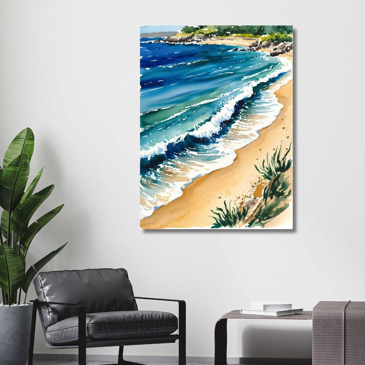 Let your eyes wander across this watercolor beach painting where ocean waves artwork meets a soft golden shore. The fluid movement of the waves, sunlit sparkle on water, and coastal plants dancing in the breeze create a visual rhythm that echoes the peaceful hum of the sea.
