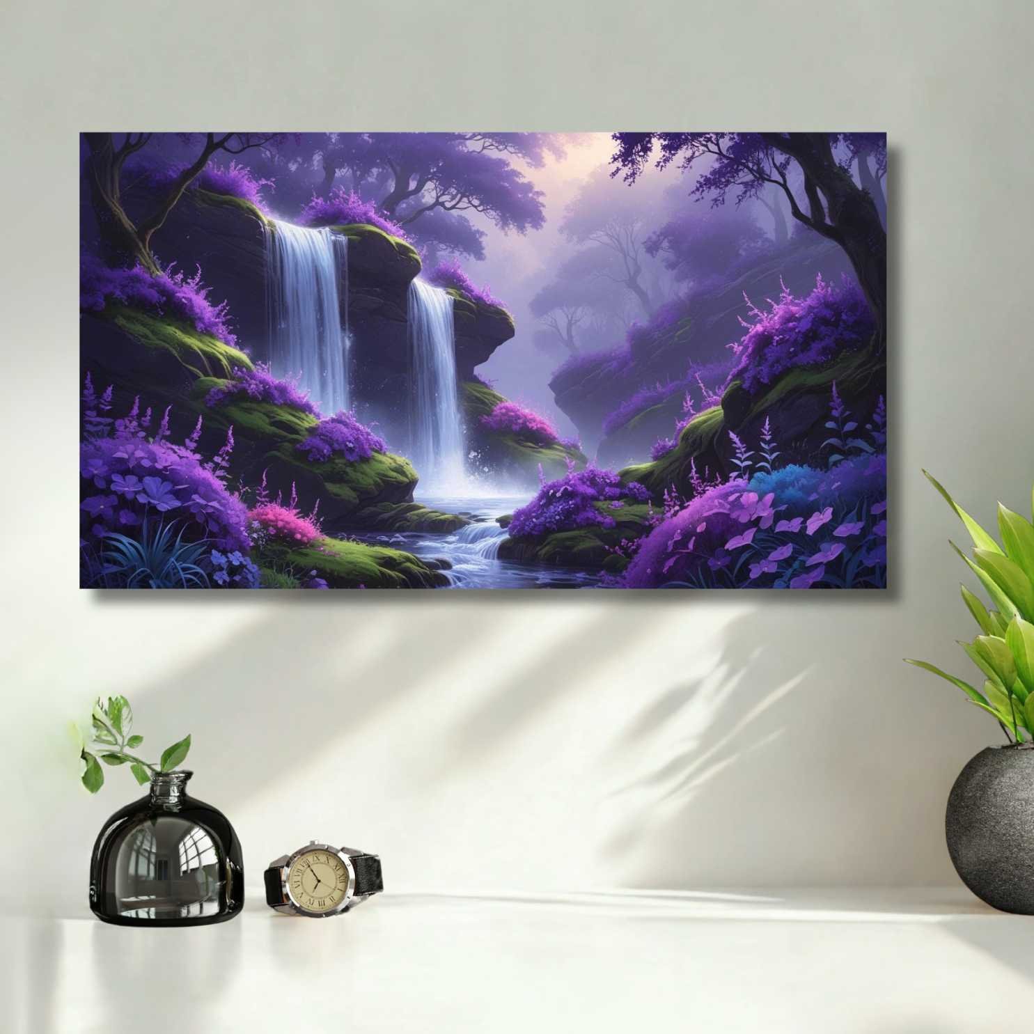 Bring the magic of nature into your home with this watercolor nature artwork titled “Enchanted Waterfall Forest.” This A4-size masterpiece features a breathtaking twin waterfall flowing through a dreamy purple forest, painted in a soft, glowing watercolor style. The vibrant hues of lavender, moss green, and twilight blues make this artwork a captivating centerpiece for any wall.