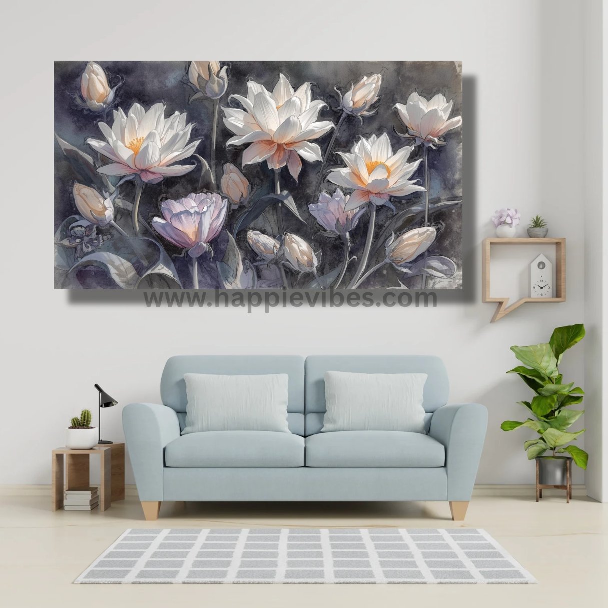 This elegant floral wall art transforms your interiors into a haven of calm sophistication. The composition of multiple blossoms conveys unity and renewal — a symbol of purity rising through life’s transitions. Ideal for modern living rooms, bedrooms, or meditation spaces, it complements both minimal and classic interiors, infusing them with balance and positivity.