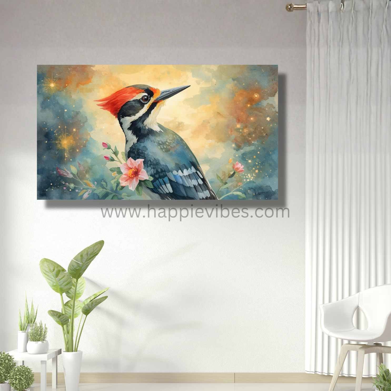 - Gaze upon the distinctive charm of a woodpecker, its vibrant crest a beacon against a backdrop of starlit clouds and luminous, blossoming flowers. This “Forest Guardian” artwork is more than just a whimsical bird painting—it’s a captivating ode to nature’s intricate beauty and the quiet strength of its inhabitants. Our enchanting Woodpecker canvas art captures the bird’s unique character amidst ethereal light and soft, glowing blooms, inviting a sense of wonder, imagination, and tranquil warmth into your home. It’s a beautifully rendered piece, designed to inspire curiosity, awaken your connection to the wild, and infuse your space with enchanting positivity.Allow this inspiring Woodpecker canvas art to transform your room into a sanctuary of whimsical charm, reminding you of the hidden magic in every forest and garden. It calms the mind, sparks a sense of gentle discovery, and reinforces a deep appreciation for the subtle wonders of the natural world. Perfect for a living room, study, or bedroom, it adds a striking layer of unique artistry and an atmosphere of serene delight. Discover more captivating and inspiring pieces for your home at: https://www.happievibes.com/shop/. Each piece is an exclusive creation, carefully designed and brought to life by the artist in their unique style.
